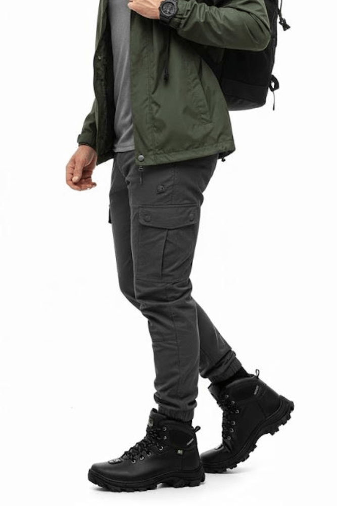 Para um visual equilibrado entre rústico e estiloso, combina a bota coturno Huron Adventure com uma calça jeans slim escura ou cargo caqui, uma camiseta básica de algodão e uma jaqueta de couro ou parka. Acessórios como um relógio robusto e óculos de sol completam o look, perfeito pra um rolê ao ar livre ou um barzinho à noite.