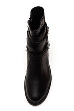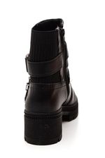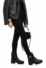 Combine a bota com uma calça jeans skinny de lavagem escura, uma blusa de tricô oversized em tons neutros e uma jaqueta de couro preta. Acessórios como um chapéu fedora e uma bolsa crossbody completam o visual, ideal para um passeio urbano ou um encontro casual.