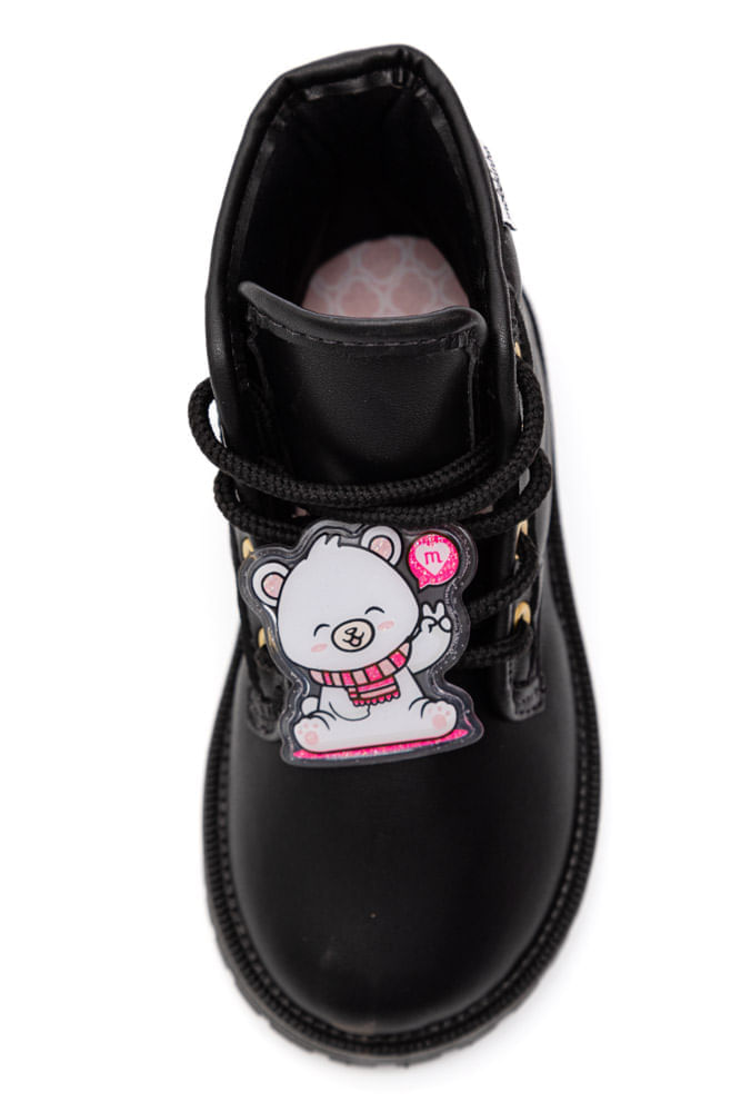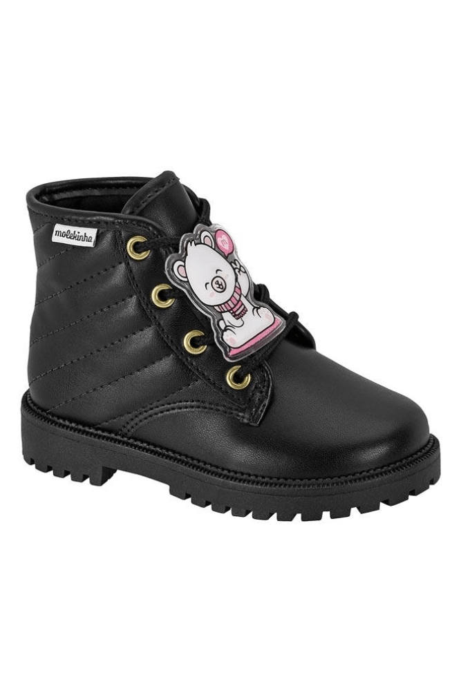A Bota Molekinha Coturno Infantil Menina Cano Médio 2126.522 é confeccionado em napa, um material leve e macio que oferece conforto. Seu bico é arredondado, proporcionando maior liberdade aos dedos. O fechamento é feito com cadarço, e o solado tratorado garante estabilidade e segurança, ideal para as crianças. A construção do modelo é com altura de cano curto, que chega a 7 cm, com circunferência de 21 cm, conferindo um ajuste confortável. O salto possui 2 cm de altura e é baixo, proporcionando maior equilíbrio. O forro interior é suave, e a palmilha é acolchoada. O destaque do design é o pingente de ursinho no cadarço, conferindo um charme especial à peça.