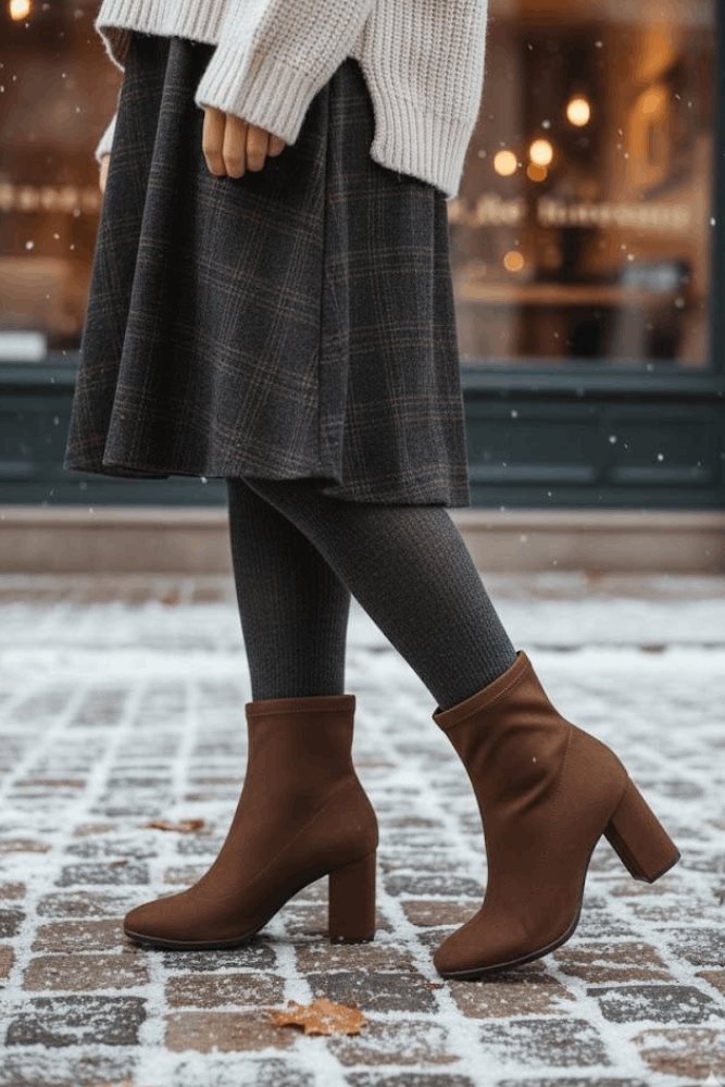 Um look feminino moderno pode combinar a Bota Via Marte com um vestido midi, saia plissada, calça de alfaiataria, shorts de couro, macacão, trench coat, blusa de seda, cardigan longo, jaqueta de couro, kimono ou saia lápis. Essas peças garantem um visual elegante e versátil para diversas ocasiões.