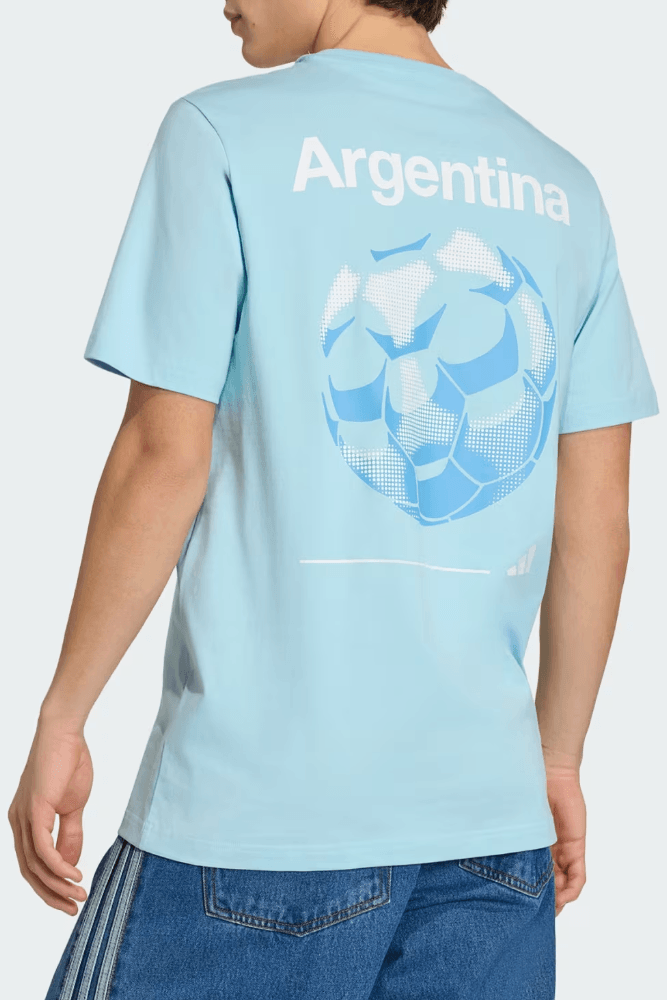 Camiseta Adidas Arg Tng Gt Masculina KB9498 com calça jeans slim, tênis branco esportivo e jaqueta leve para um look casual com pegada esportiva ideal para passeios e jogos. Acrescente boné e relógio esportivo para mais estilo e conforto. Visual moderno, confortável e versátil para o dia a dia com identidade esportiva marcante e autêntica inspiração no futebol.