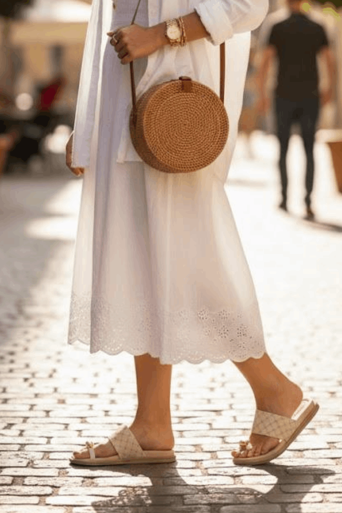 Para um look casual chic, combine a rasteira Beira Rio com vestido midi estampado em tons neutros, bolsa tiracolo caramelo e acessórios dourados para harmonizar com o adorno metálico do chinelo. Finalize com óculos de sol estilosos e um coque baixo. Ideal para um almoço especial ou passeio de fim de semana com elegância e conforto.