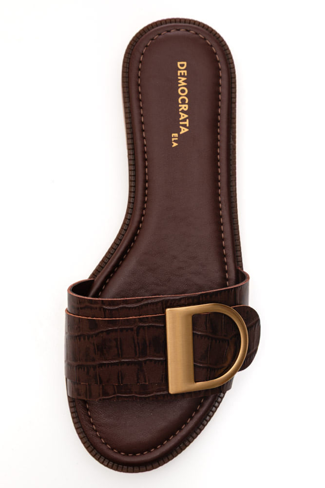 Para um look casual elegante, combine a rasteira Democrata em couro com calça pantacourt ou jeans reto, blusa de tecido leve e blazer estruturado. Finalize com bolsa média, acessórios dourados discretos e maquiagem natural. O visual fica moderno, confortável e sofisticado, ideal para compromissos diurnos ou passeios urbanos.