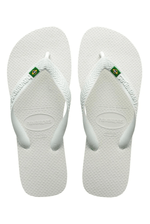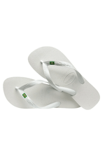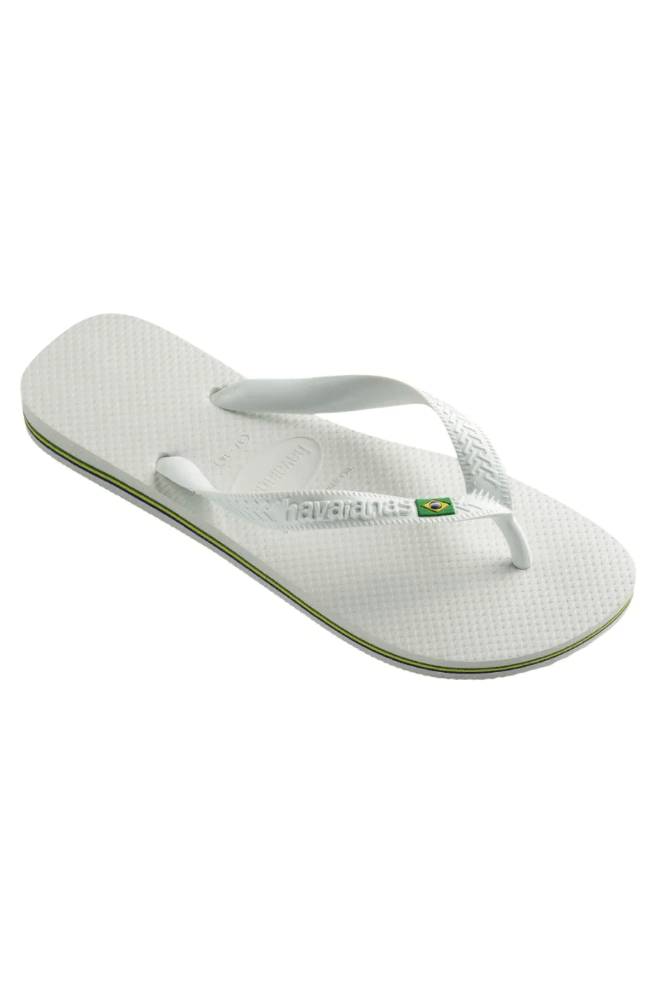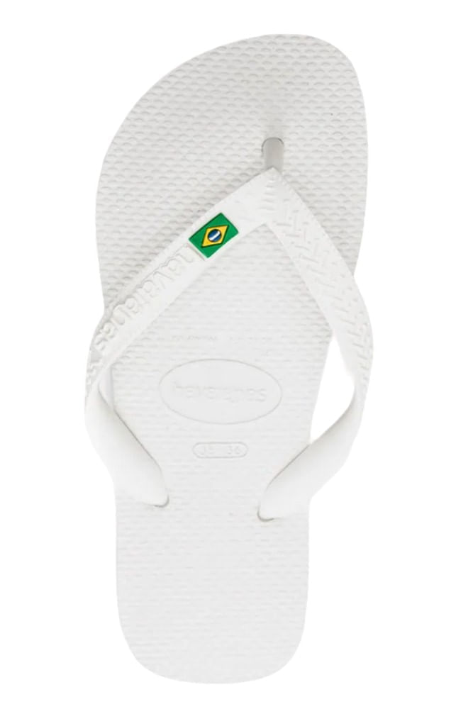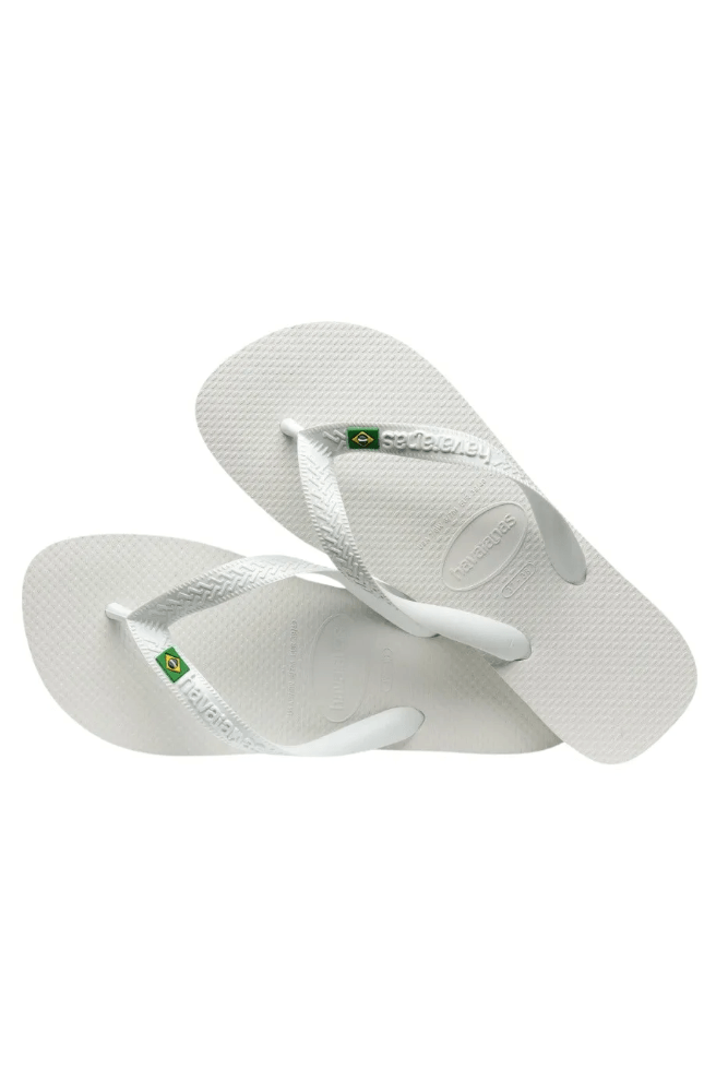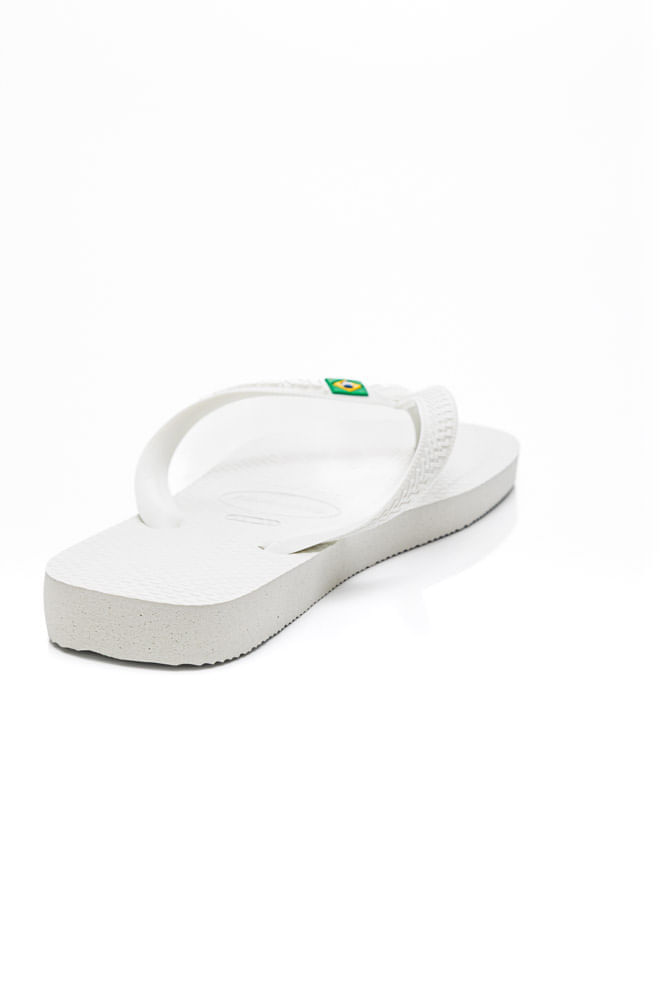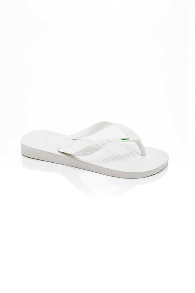 O Chinelo Havaianas Top Brasil 0001, é confeccionado em borracha por inteiro e de boa qualidade. O clássico modelo de chinelo de dedo que é muito confortável e leve. Possui duas tiras Regular Monocolor Brasil de espessura mediada em sentido reto próximo aos dedos que se unem fixados ao solado na altura do dedão, formando um “V”. Aplicação da bandeira do brasil na tira que fica por sobre o peito do pé.