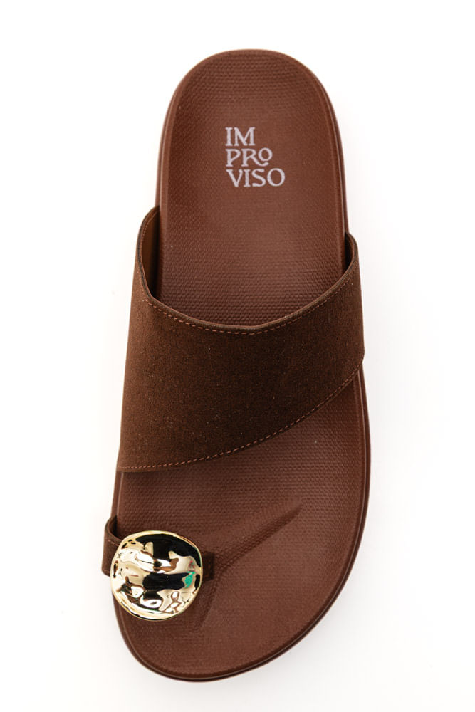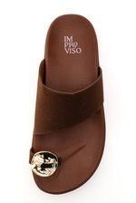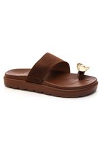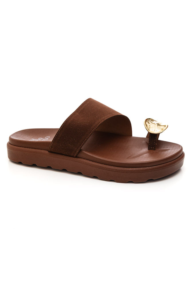 O Chinelo Improviso Rasteiro Feminino Detalhe Orgânico 3048.1352, estilo slide com separador de dedo é a escolha ideal para quem busca conforto com sofisticação casual. Da categoria casual feminina, o modelo é confeccionado em camurça suede, que oferece toque macio e visual elegante em tom marrom café. Não possui fechamento, garantindo calce fácil e prático no dia a dia. O bico é aberto, no formato de dedo, e o salto é baixo com base flatform levemente tratorada, trazendo mais estabilidade ao caminhar. A sola em material sintético emborrachado é anatômica e acompanha a curvatura do pé. A palmilha é confortável e bem estruturada. O grande destaque fica por conta do ornamento metálico dourado com efeito orgânico, que valoriza o design. Versátil, ela une estilo boho chic, segurança e bem-estar para uso prolongado.