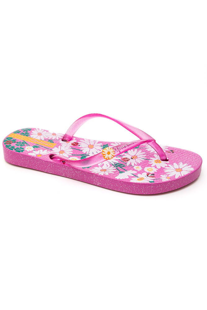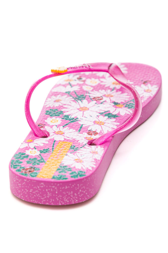 O Chinelo Ipanema Juvenil Menina Estampa 27273-Bq756 é confeccionado em PVC, garantindo leveza e durabilidade para o uso diário. Possui solado emborrachado que oferece segurança e conforto a cada passo. O destaque fica por conta da estampa floral colorida no solado, com margaridas e joaninhas, que transmite alegria e delicadeza. Suas tiras finas e brilhantes no estilo tradicional trazem um toque moderno, além de detalhe em flor com o logo da marca. O modelo tem formato reto e bico arredondado, sem fechamento, facilitando o calce. Ideal para momentos de lazer, praia ou piscina, une praticidade, estilo e o charme característico da Ipanema.
