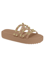 CHINELO MOLECA 5489.121.9569,é um modelo Slide Plataforma que combina a praticidade do calce fácil com uma forte pegada fashion e rocker, dada pela aplicação de tachas metálicas. É um calçado de destaque, perfeito para quem busca um visual moderno, confortável e com atitude.