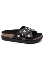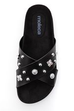 O Chinelo Moleca Papete Birken Feminino Em Napa 5500.112 é uma sandália slide com tiras cruzadas em napa sintética, decoradas com apliques metálicos sutis que conferem charme ao visual. Possui palmilha anatômica em EVA revestida com nobuck, oferecendo conforto, maciez e leve amortecimento, com altura aproximada de 2 cm. O solado é tratorado em borracha TR antiderrapante, garantindo leveza, segurança e estabilidade no uso diário. O forro interno têxtil proporciona boa respirabilidade, tornando o modelo ideal para passeios e rotina. O formato é aberto, com design estilo Birken, e não possui fechamento, sendo de calce fácil tipo slide. A marca Moleca aparece discretamente na palmilha, reforçando a autenticidade do produto.