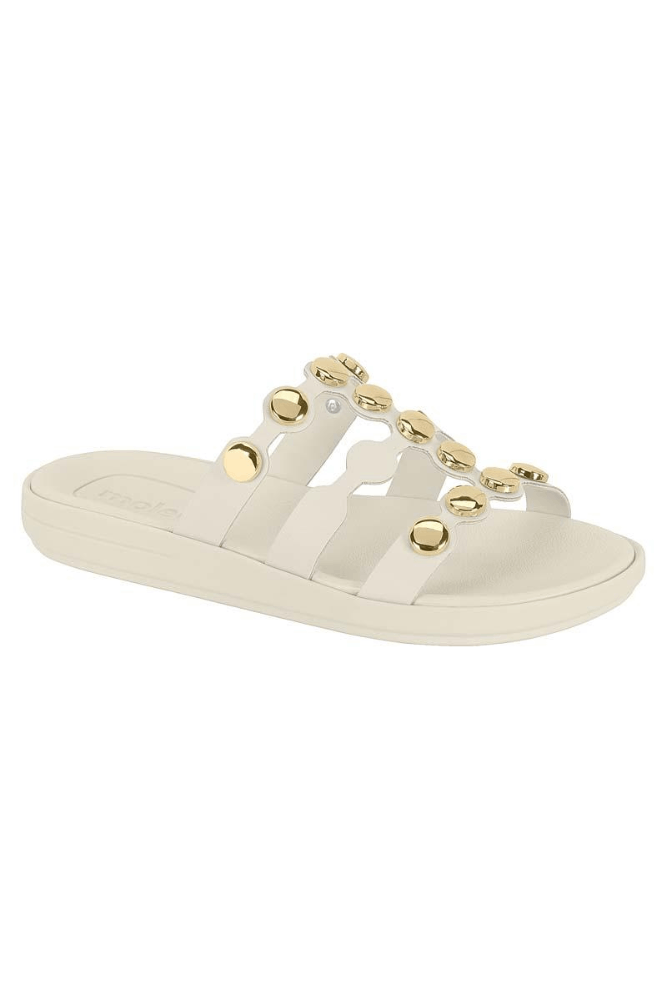 O Chinelo Moleca Rasteira Feminino Napa 5525.105.9569 é confeccionado em Napa Turim, material sintético de alta qualidade que garante durabilidade e visual sofisticado. Possui solado em TR antiderrapante, oferecendo segurança e firmeza ao caminhar, com estampa lisa discreta. O modelo conta com tiras múltiplas cruzadas adornadas com rebites dourados, trazendo charme e sofisticação ao visual. Seu formato é arredondado, proporcionando um calce confortável e anatômico. A palmilha em EVA macia assegura bem-estar prolongado, ideal para o dia a dia. A marca Moleca aparece discretamente na palmilha, reforçando autenticidade e estilo.