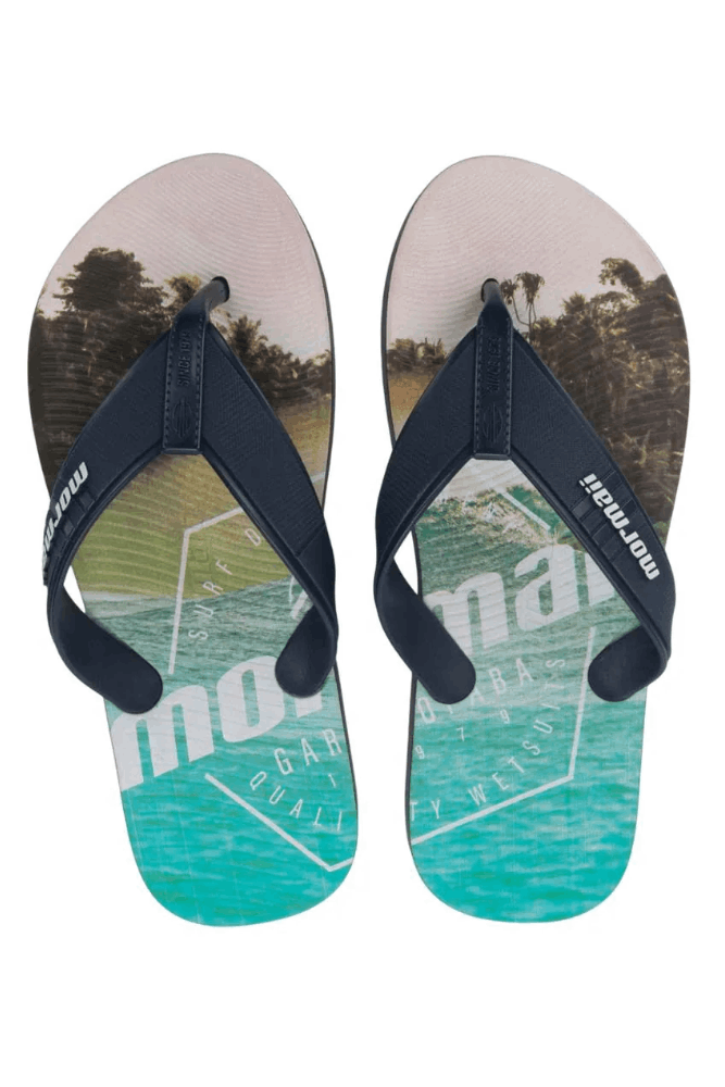 O Chinelo Mormaii Tropical Graphics Ad Masculino Slim 10591-Bk970 é feito em PVC leve, com solado de borracha resistente que traz estampas exclusivas com paisagens e lettering sobreposto. O solado apresenta textura antiderrapante para melhor aderência. As tiras são do tipo slim, porém com forquilha mais larga, texturizada para simular tecido têxtil, com pespontos em relevo e o logo Mormaii em destaque. O formato é anatômico para conforto e ajuste seguro. Não possui fechamento adicional, garantindo praticidade no calce. É um modelo funcional, jovem e moderno, ideal para uso casual com toque surfwear.