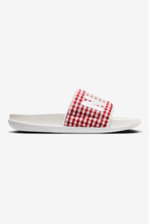 O Chinelo Nike Offcourt Feminino Fn6603-600 é feito em material sintético leve com palmilha de espuma de dupla densidade que garante amortecimento e conforto superiores. O solado em borracha traz padrão de tração circular inspirado no AF1, oferecendo aderência durável. A tira é larga, acolchoada e forrada em jersey macio, proporcionando ajuste suave e prático. O formato anatômico abraça o pé com estabilidade, sem necessidade de fechamento. A alça exibe o logo Nike em relevo e design xadrez moderno, unindo estilo e funcionalidade para uso diário.
