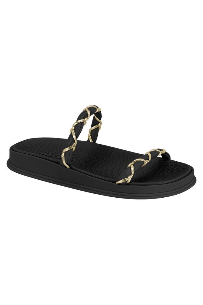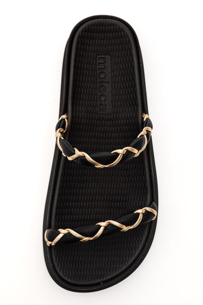 O Chinelo Papete Moleca Em Tiras Trançadas 5556108 Leveza e bem-estar para os seus pés é ideal para quem busca conforto sem abrir mão do estilo. Perfeito para o dia a dia, passeios rápidos, praia ou piscina, este modelo é confeccionado com tiras de napa flexível que se adaptam ao pé, garantindo um calce seguro e agradável. Possui sola plana em PVC expandido macio com leve relevo em trama, proporcionando aderência e conforto a cada passo. O bico arredondado complementa a estética minimalista e moderna, enquanto as tiras trançadas com fio metálico delicado conferem um brilho sutil que chama atenção. A palmilha macia oferece conforto extra, promovendo bem-estar e praticidade.
