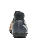 A chuteira conta com cabedal slip-on em meia com elastano, que oferece ajuste anatômico e facilidade no calce.