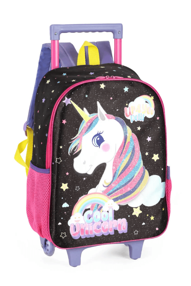 A Mochila Luxcel De Rodinha Unicórnio Ic41012up é confeccionada em 100% poliéster, oferecendo leveza, resistência e fácil limpeza para a rotina escolar. Possui capacidade aproximada de 20 litros e dimensões em torno de 45 cm de altura, 30 cm de largura e 15 cm de profundidade, garantindo ótimo espaço interno. Conta com um bolso principal amplo e dois bolsos laterais, ideais para squeeze e pequenos objetos. O fechamento em zíper, com puxadores personalizados, traz praticidade e segurança. As alças traseiras e as costas são acolchoadas e ajustáveis, permitindo uso nas costas quando necessário, além de alça de mão reforçada. O carrinho em metal com rodinhas de silicone facilita o transporte. O design infantil de unicórnio é alegre e encantador. O acabamento reforçado, com tag de identificação, garante durabilidade e funcionalidade no dia a dia.