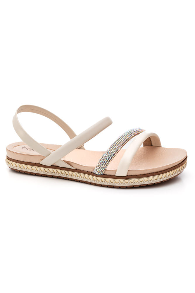 Para um look elegante com a sandália Beira Rio Flat Strass, combine um vestido midi fluido em tons neutros, como bege ou branco, e acessórios delicados em dourado. Aposte em uma bolsa pequena tiracolo e um coque baixo para um visual sofisticado. Ideal para eventos diurnos ou encontros casuais com toque de glamour.