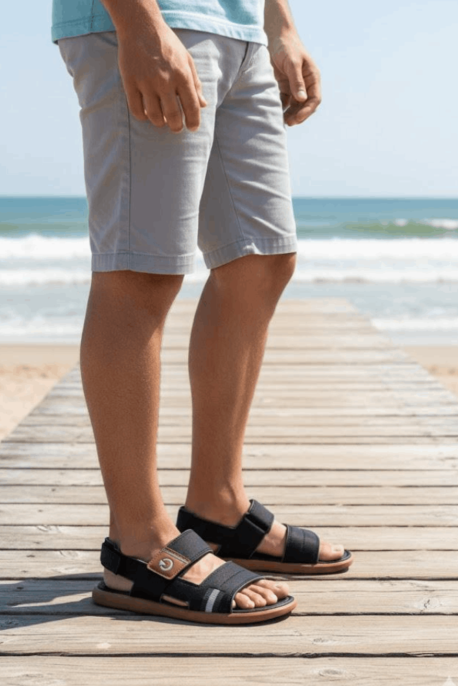 Você pode combinar de várias maneiras para criar looks elegantes e modernos. Experimente usá-lo com uma camiseta básica de algodão, uma camisa de botão de linho, uma polo clássica, um short de sarja, uma bermuda estampada, uma calça chino, uma jaqueta leve, um colete jeans, um suéter de malha fina e um agasalho casual. Essas peças oferecem versatilidade e conforto, complementando a sandália de forma estilosa.
