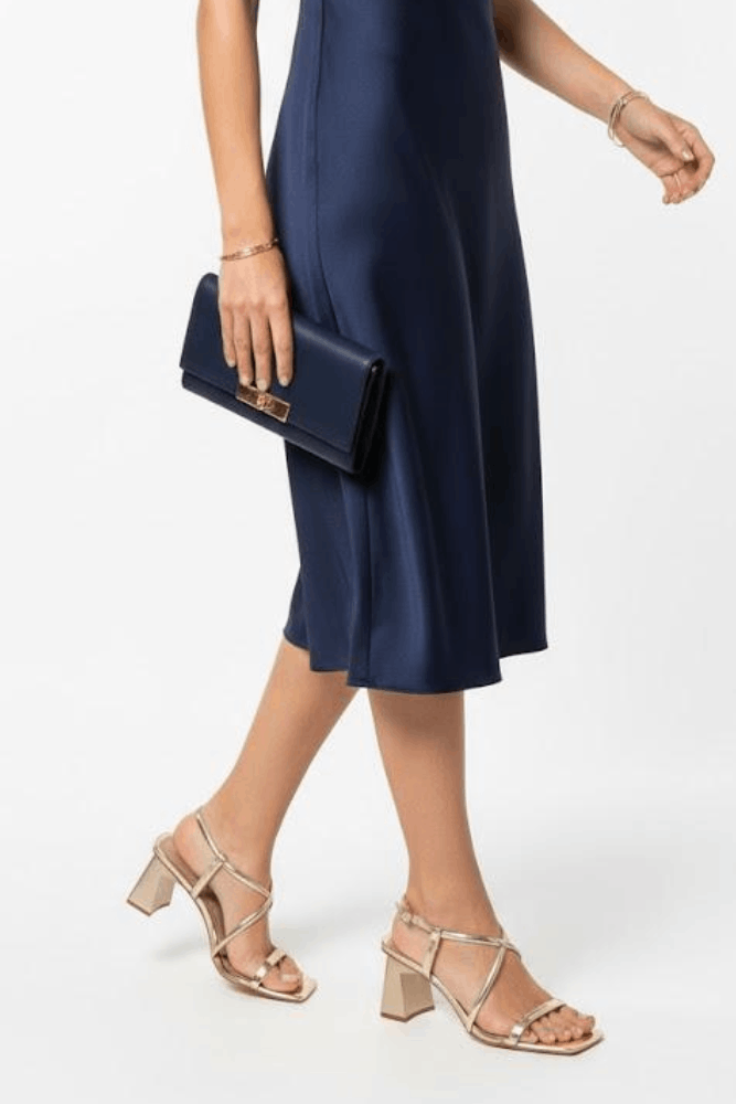 Para um jantar especial, combine a Sandália Chá de Mel Salto Médio com um vestido midi fluido em tons neutros, acessórios dourados delicados e uma clutch sofisticada. Complete o look com uma make leve e cabelo solto em ondas suaves. O resultado é um visual elegante, confortável e versátil, perfeito para impressionar com charme natural.