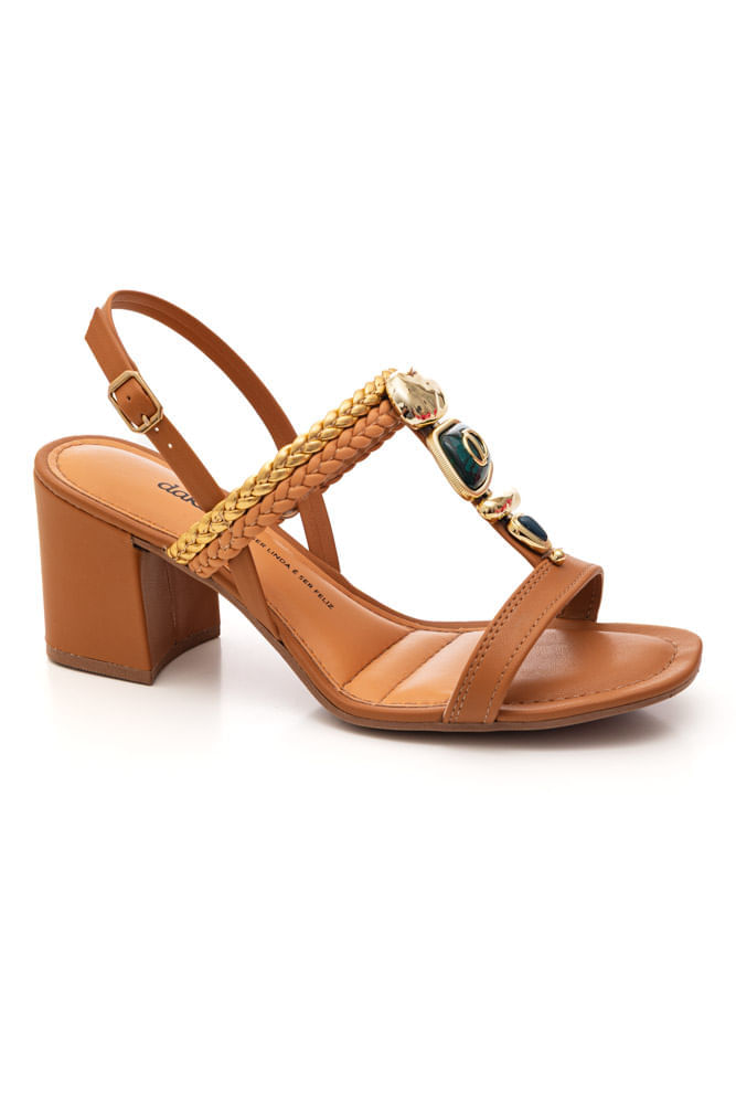 Para um jantar especial ou evento casual chic, combine a sandália Dakota com vestido midi em tons neutros, tecido fluido e recorte elegante. Acrescente bolsa tiracolo estruturada, brincos delicados dourados e maquiagem iluminada. O salto bloco garante conforto, enquanto as pedrarias elevam o visual com sofisticação e charme na medida certa.