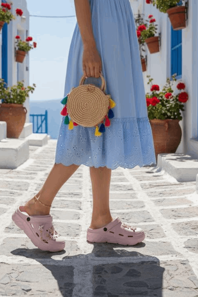 Para um look casual com estilo, combine a Sandália Delcol Babuche com um vestido midi preto estruturado, jaqueta jeans oversize e uma bolsa hobo em couro. A leveza da sandália equilibra o visual urbano da jaqueta e a sofisticação do vestido, criando uma composição confortável, moderna e perfeita para um passeio descontraído ou um encontro informal.