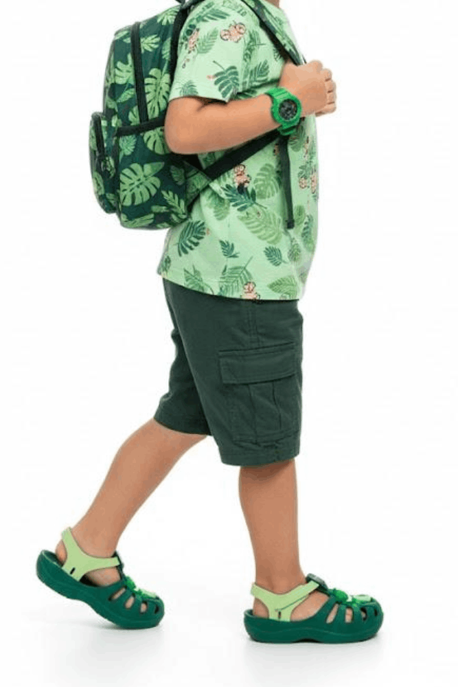 Para um passeio divertido, combine a Sandália Grendene Babuche Rex Toy Story com uma bermuda verde clara, camiseta estampada do filme e um boné divertido. Complete o look com uma mochilinha temática para carregar brinquedos. Esse visual garante conforto, estilo e praticidade, perfeito para brincar no parque, passear em família ou viver aventuras cheias de imaginação.