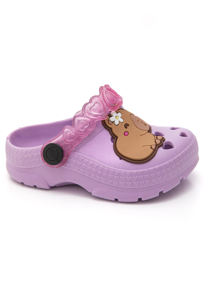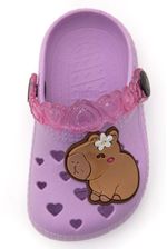 A Sandália Lue Lua Babuche Love Infantil Capivara 143029-925 é feita completamente em PVC expandido, com cabedal resistente e flexível, perfeito para o dia a dia das crianças. Possui uma tira no calcanhar em material sintético translúcido que pode ser movida para frente ou para trás, oferecendo duas formas de uso e praticidade para o ajuste. Seu bico é arredondado e confortável, a sola também é em PVC expandido, garantindo segurança a cada passo, e a palmilha macia proporciona conforto extra. O destaque vai para o aplique em relevo de uma capivara delicada e os pequenos corações texturizados, trazendo charme e diversão. Além de estilosa, promove conforto e segurança para os pés.