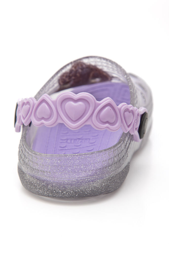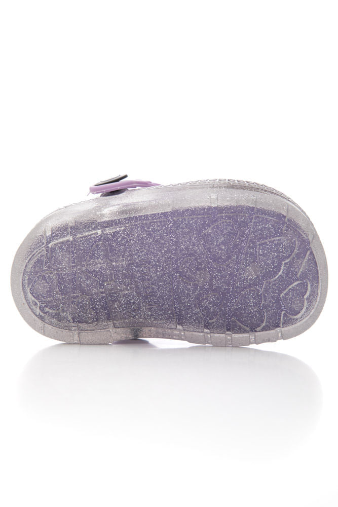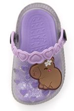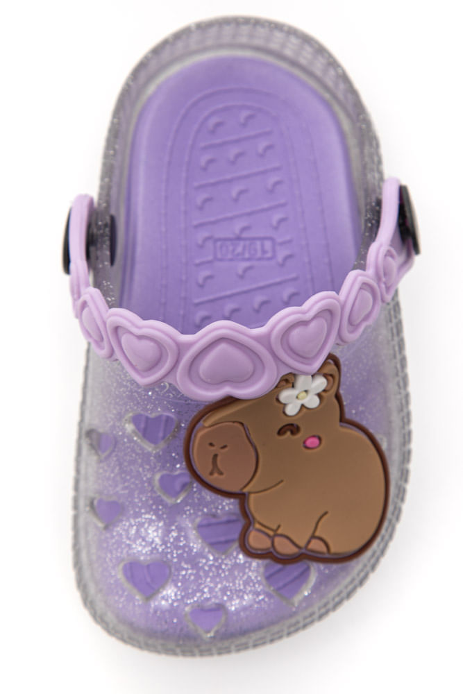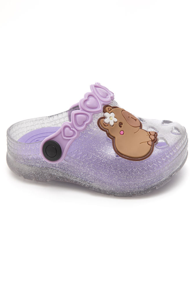 A Sandália Lue Lua Babuche Love Infantil Capivara 158007-532 garante conforto e estilo para os pés da sua pequena. Feita em PVC translúcido com acabamento em glitter, o cabedal oferece brilho divertido, enquanto a superfície texturizada com pequenos corações em relevo adiciona charme delicado. Na parte frontal, um aplique em relevo de capivara encanta e chama atenção, tornando cada passo mais alegre. Possui bico arredondado, palmilha em EVA removível que garante conforto, e solado em PVC resistente. A tira no calcanhar é ajustável, podendo ser usada para frente ou para trás, oferecendo versatilidade e segurança a cada movimento.