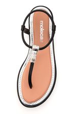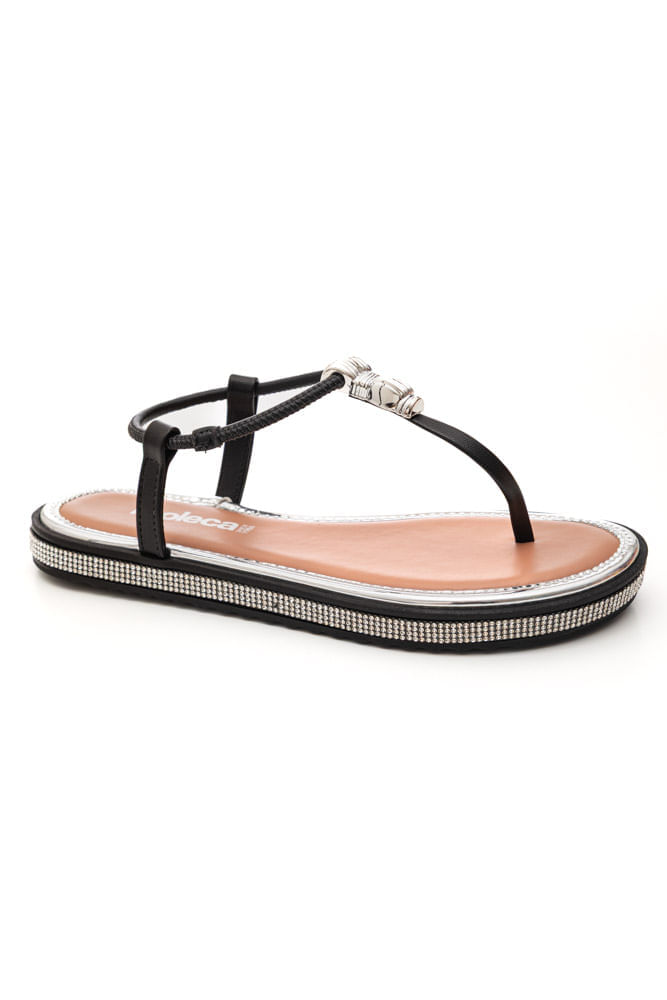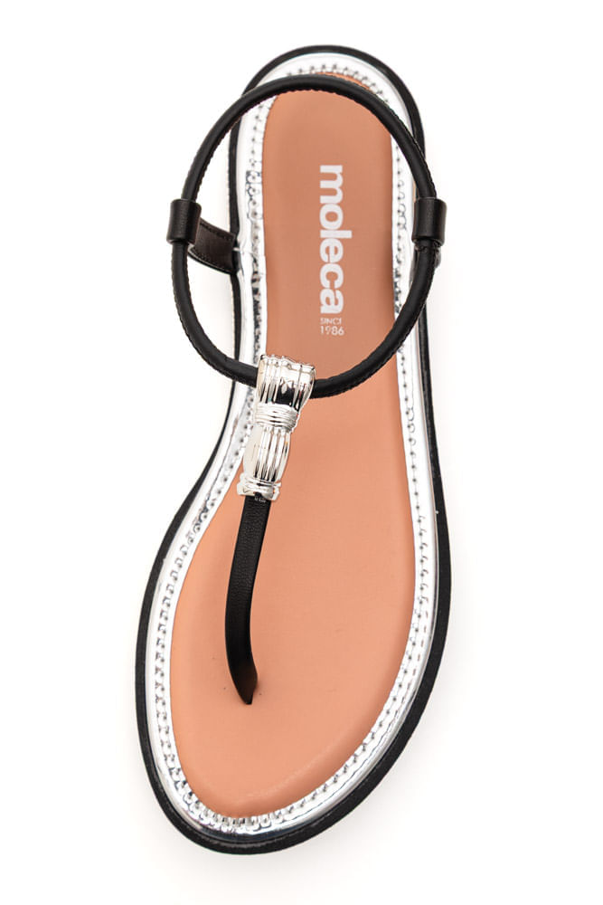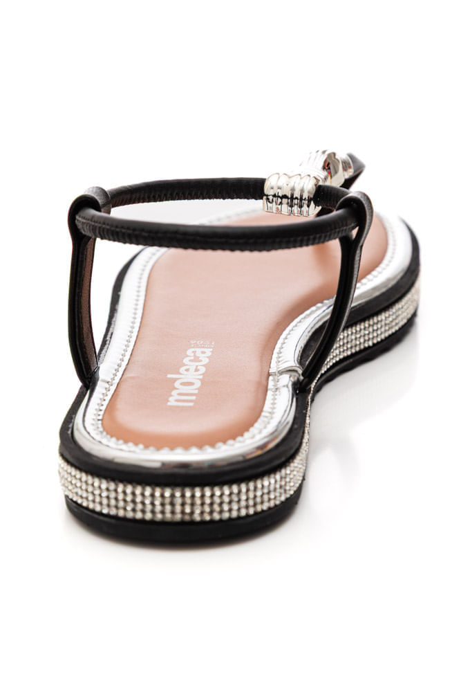Para um passeio de verão à tarde, combine a rasteira Moleca preta com detalhes prateados a um vestido midi fluído em tons claros, uma bolsa tiracolo neutra e acessórios delicados em prata. Finalize com óculos de sol elegantes e cabelos soltos. O look transmite conforto, sofisticação discreta e estilo casual-chic, perfeito para passeios ou encontros descontraídos.