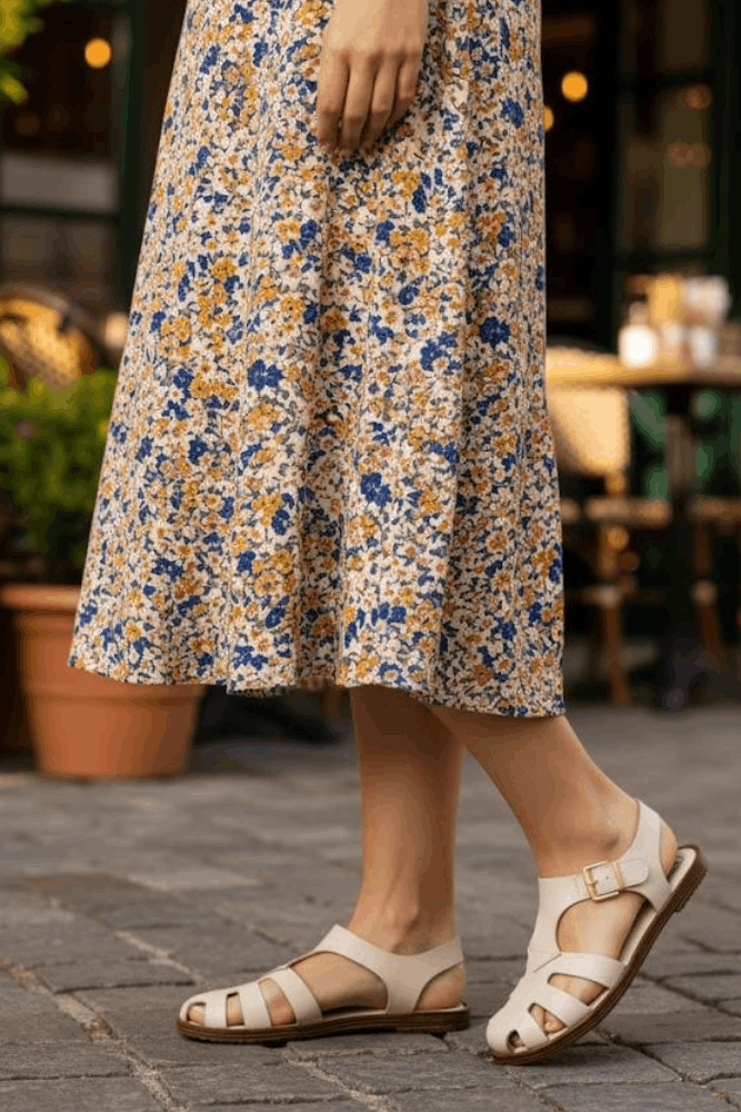 Para um look leve e elegante, combine a Sandália Moleca rasteira com vestido midi floral, bolsa tiracolo em palha e acessórios delicados em dourado. O saltinho baixo garante conforto para um passeio ao ar livre ou encontro descontraído, enquanto o design sofisticado com tiras largas traz charme extra ao visual.