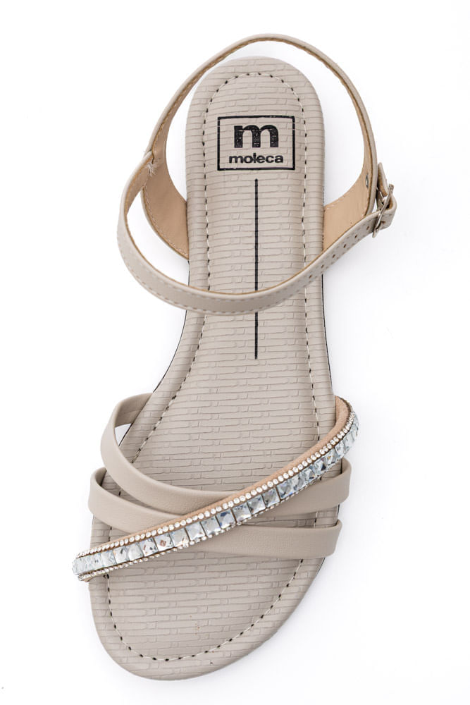 Combine a sandália Moleca com um vestido midi fluido em tom pastel, bolsa tiracolo neutra e brincos delicados. Para um toque extra de elegância, opte por um penteado semi-preso e maquiagem leve com iluminador. O brilho das pedrarias da sandália completa o look com sofisticação, ideal para um almoço especial ou passeio ao fim da tarde.