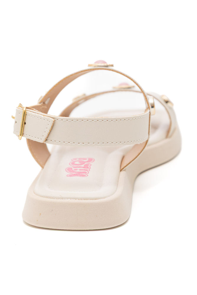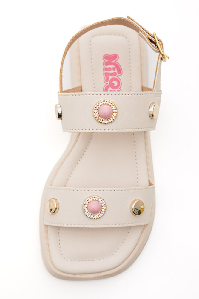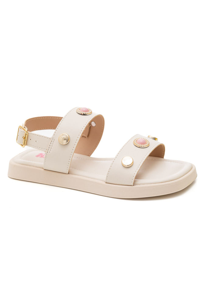 SANDALIA NILQI 400.02.19 Sandália Infantil/Juvenil Nilqi 400.02.19 - Charme e Elegância para Brilhar! A Sandália Nilqi 400.02.19 é a escolha perfeita para adicionar um toque de sofisticação e estilo aos pés das pequenas fashionistas. Em um tom clássico off-white ou creme, este modelo se destaca pelos seus detalhes brilhantes e seu design moderno, ideal para ocasiões especiais ou para um toque de glamour no dia a dia. Características: Design Sofisticado: Com duas tiras largas e elegantes no cabedal, uma sobre os dedos e outra no peito do pé, a sandália oferece um visual clean e chique. Detalhes de Joia: O grande destaque fica por conta dos apliques redondos com moldura dourada e centro em tom rosado/pêssego, que imitam pedras preciosas, conferindo um brilho sutil e muito charme. Apliques Metalizados: Pequenas tachas douradas complementam os detalhes em joia, adicionando um toque moderno e um acabamento premium à sandália. Conforto e Praticidade: Possui uma tira ajustável no tornozelo com fivela dourada, garantindo um calce seguro e um ajuste perfeito. A palmilha macia proporciona conforto a cada passo. Bico Quadrado: O formato do bico quadrado confere um toque de modernidade e tendência ao design da sandália. Versatilidade de Cor: O tom neutro off-white é extremamente versátil, permitindo que a sandália seja combinada com uma vasta gama de cores e estilos de roupas. A Sandália Nilqi 400.02.19 é ideal para quem busca um calçado que alie beleza, conforto e um toque de glamour para os momentos mais especiais ou para elevar qualquer look.