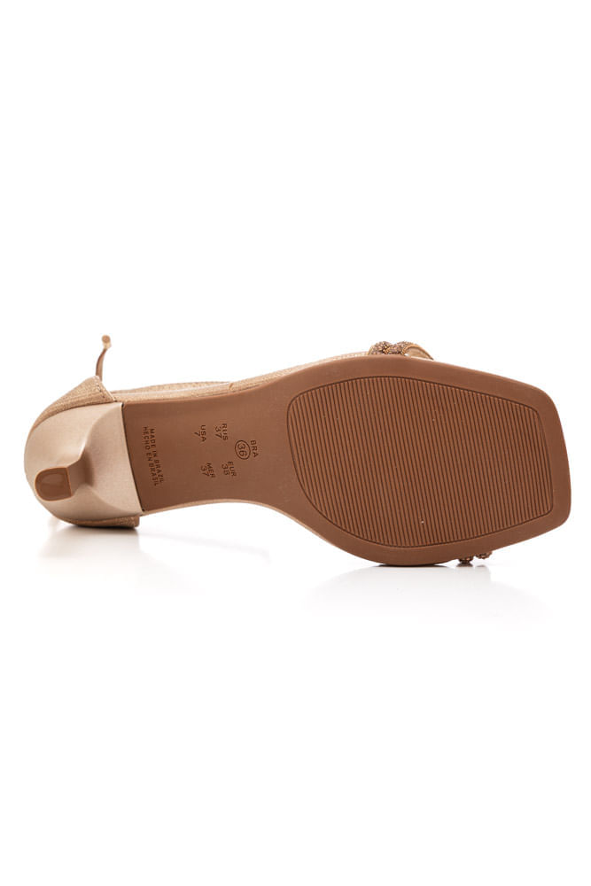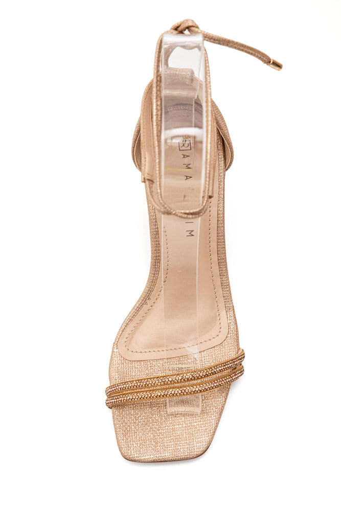 Para um look marcante com a sandália Ramarim dourada de salto fino, combine um vestido midi preto acetinado, clutch estruturada dourada e brincos alongados. Finalize com uma maquiagem iluminada e um coque baixo elegante. O contraste entre o dourado e o preto garante sofisticação imediata, perfeita para eventos noturnos ou celebrações refinadas.