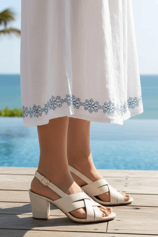 Para um look com a Sandália Salto Beira Rio Slingback, combine uma calça branca de linho com uma regata off-white gola V. Acrescente acessórios dourados minimalistas. Finalize com brincos dourados, bolsa estruturada preta e óculos de sol. O salto bloco garante conforto e sofisticação, ideal para um almoço elegante ou evento casual refinado.