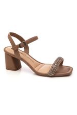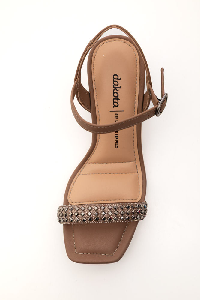 SANDALIA SALTO MEDIO DAKOTA Y9764-04, O salto bloco médio (aproximadamente $7,0 \text{ cm}$) oferece a altura ideal, garantindo estabilidade e conforto para você aproveitar a festa ou o evento casual por horas. O destaque fica por conta das tiras frontais adornadas com pedraria/strass, que capturam a luz e adicionam um brilho discreto e sofisticado a cada passo.