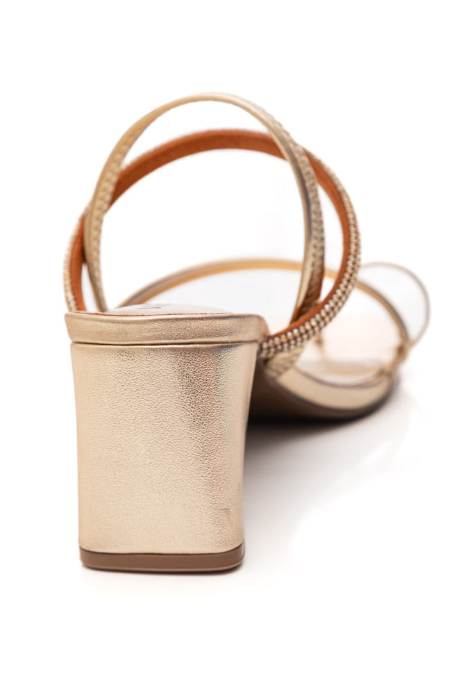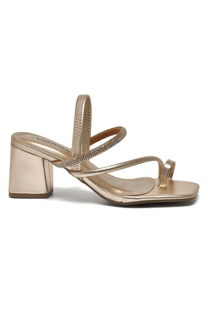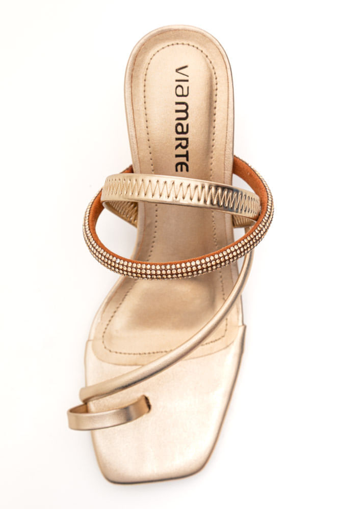 Para um dia de trabalho elegante ou um happy hour, combine a sandália Via Marte dourada com uma calça de alfaiataria clara, blusa em tecido fluido e blazer estruturado. Complete com bolsa média, acessórios dourados delicados e maquiagem leve, criando um visual moderno, sofisticado e confortável para diversas ocasiões.