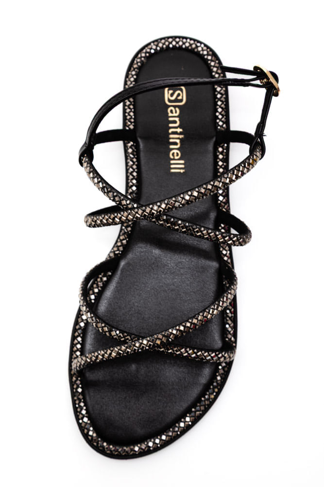 A Sandália Santinelli Rasteira Feminina Em Strass 1618-008 é perfeita para quem busca elegância com conforto no dia a dia. Seu design apresenta múltiplas tiras finas cruzadas no peito do pé, adornadas com pedrarias que trazem brilho e sofisticação ao look. O fechamento é por tira ajustável no tornozelo com fivela dourada, permitindo encaixe firme e seguro. A categoria é rasteira, com solado emborrachado raso e confortável, ideal para caminhadas leves. O bico arredondado proporciona acomodação natural dos dedos, enquanto a palmilha macia garante bem-estar ao longo do uso. A estética delicada faz com que a peça seja versátil, combinando tanto com looks casuais quanto com produções mais arrumadas. Um grande benefício é poder elevar o visual com leveza e praticidade.