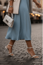 Para um evento noturno elegante, combine a sandália Via Marte dourada com um vestido midi preto ajustado, valorizando a silhueta, e opte por acessórios minimalistas em tons de dourado para harmonizar o look. Finalize com uma clutch preta texturizada e maquiagem em tons neutros com um toque de brilho nos olhos, garantindo sofisticação e modernidade.
