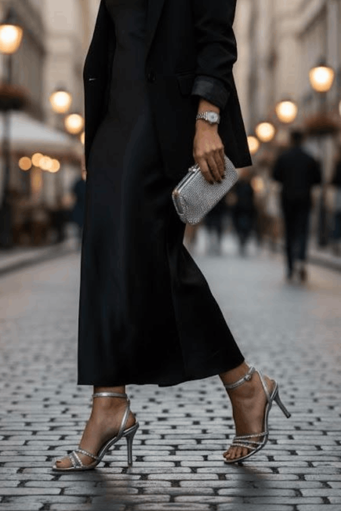 Para um evento noturno elegante, combine a sandália Via Marte dourada com um vestido midi preto ajustado, valorizando a silhueta, e opte por acessórios minimalistas em tons de dourado para harmonizar o look. Finalize com uma clutch preta texturizada e maquiagem em tons neutros com um toque de brilho nos olhos, garantindo sofisticação e modernidade.