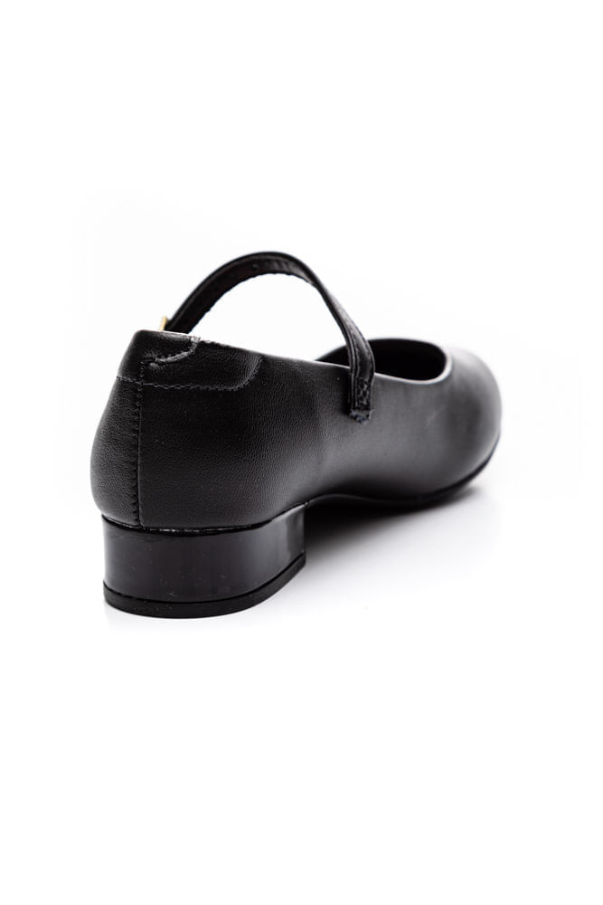 Seu cabedal em cor única é clássico e sem detalhes, traz apenas uma tira de espessura fina no peito do pé que caracteriza o estilo boneca, a tira tem fivela para fechamento e um elástico para facilitar o ajuste aos pés.