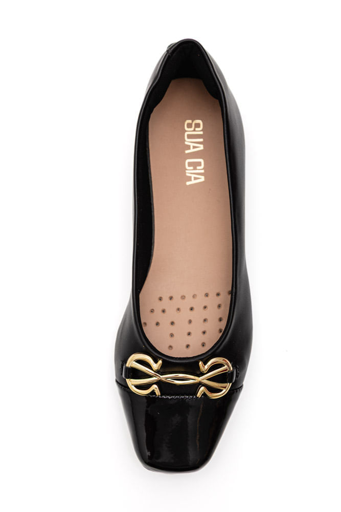 A Sapatilha Sua Cia Bico Quadrado Feminina Napa 8222.15917 é a escolha ideal para quem busca conforto com um toque de elegância no dia a dia. Da categoria casual, ela traz cabedal em Napa Soft com acabamento em verniz no bico quadrado, que garante um visual moderno e sofisticado. O destaque fica por conta do aplique ornamental dourado em formato de nó aplicado sobre o bico do sapato, que adiciona charme e personalidade ao calçado. Fácil de calçar, não possui fecho e se ajusta perfeitamente aos pés. A palmilha forrada em Napa, aliada ao forro interno em tecido, proporciona conforto prolongado. A sola emborrachada com textura antiderrapante assegura mais segurança ao caminhar. Ideal para quem não abre mão de estilo e praticidade. Você vai se apaixonar!