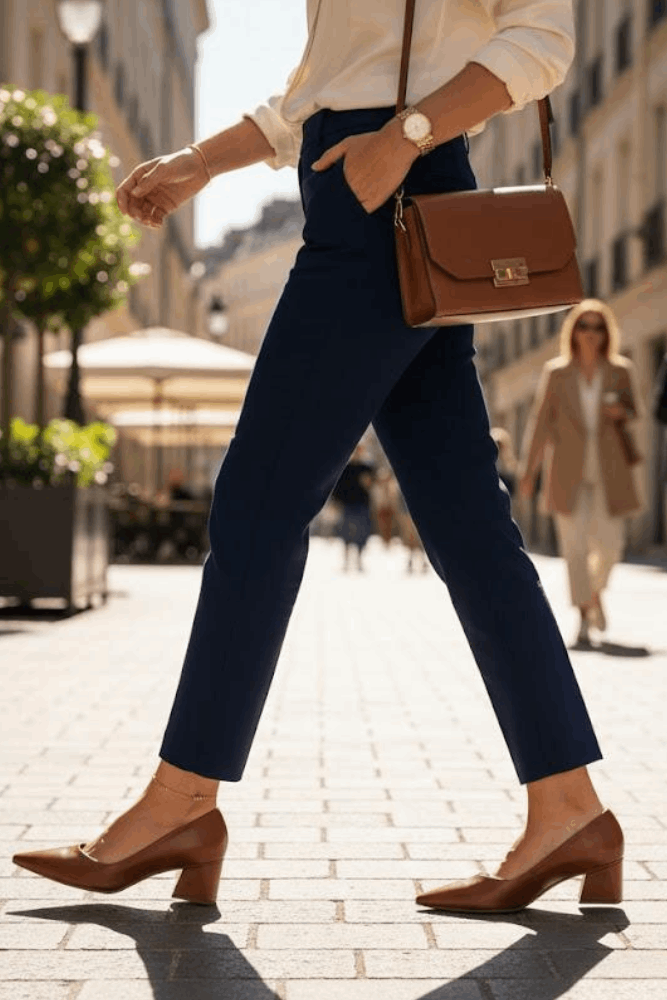 Para um dia de trabalho elegante, combine o scarpin Bebecê com uma calça de alfaiataria bege, camisa branca de seda e blazer estruturado. Complete com bolsa tiracolo nude e acessórios dourados delicados. O salto geométrico baixo garante conforto o dia todo, enquanto o bico fino adiciona sofisticação ao visual clássico e moderno.