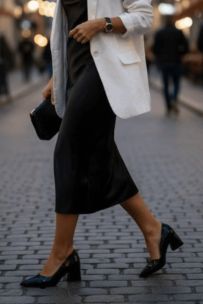 Para um dia de trabalho elegante, combine o scarpin Bebecê com uma calça de alfaiataria bege, camisa branca de seda e blazer estruturado. Complete com bolsa tiracolo nude e acessórios dourados delicados. O salto geométrico baixo garante conforto o dia todo, enquanto o bico fino adiciona sofisticação ao visual clássico e moderno.