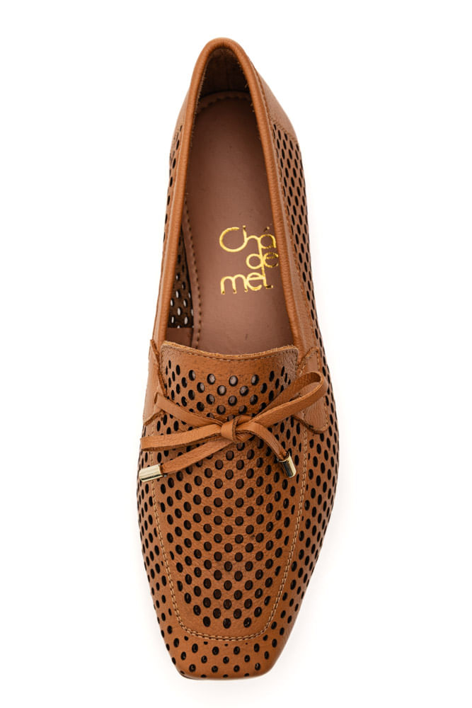 Para um almoço especial ou compromisso no trabalho, combine o mocassim Chá de Mel com calça de alfaiataria bege ou branca e blusa de seda fluida em tom pastel. Acrescente bolsa estruturada nude e acessórios dourados delicados para harmonizar com o laço. Finalize com blazer leve para um visual elegante, confortável e sofisticado.