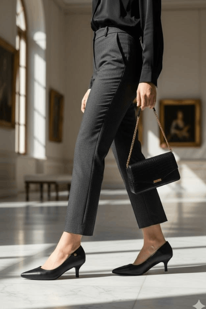 Para quem trabalha com trajes mais formal e/ou corporativo, aposte em uma calça de alfaiataria ou saia midi, com um lindo scarpin preto ou nude. Já em looks mais casuais como usá-lo com jeans, vai deixar sua composição mais sofisticada e elegante, e para dar um toque a mais, deixa a barra da calça dobrada para que apareça e permaneça definida seus traços da perna.
