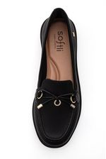 Para um look casual elegante, combine o mocassim Softli com calça jeans skinny escura, camisa branca de linho e blazer preto ajustado. Finalize com bolsa estruturada e acessórios dourados discretos. Ideal para um dia de trabalho ou encontro informal, o visual equilibra conforto e sofisticação com o charme atemporal do mocassim de sola tratorada.