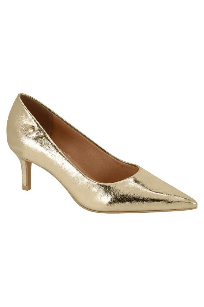 Para uma festa ou evento noturno, combine o scarpin Vizzano metalizado com um vestido midi de corte reto ou assimétrico, em tons neutros ou preto. Aposte em clutch minimalista, acessórios delicados e maquiagem iluminada. Finalize com cabelo preso ou ondas polidas para um visual elegante e sofisticado.