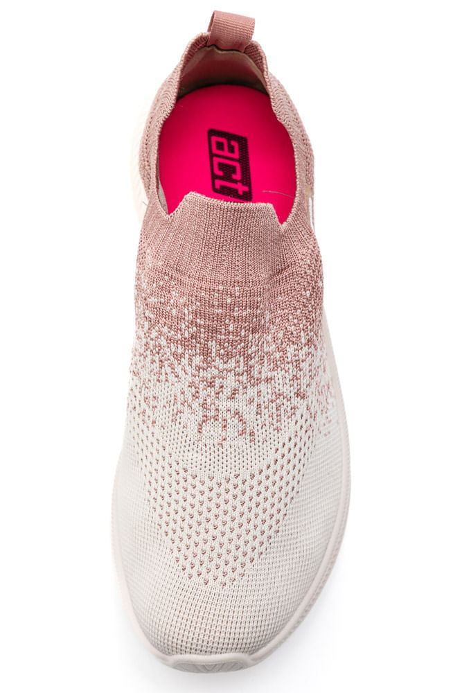O Tênis Actvitta Esportivo Feminino Calce Fácil 4829.317 possui cabedal confeccionado em material knit de alta qualidade, leve, respirável e com elasticidade que favorece o ajuste ao pé. A biqueira arredondada proporciona espaço confortável para os dedos. Seu fechamento é slip-on, ou seja, sem cadarço, facilitando o calce com tecido elástico que abraça o pé. A construção é tipo sock (meia), com lingueta integrada ao cabedal e colarinho anatômico que não incomoda. A palmilha é macia, forrada, e a calcanheira acolchoada contribui para maior estabilidade. O forro interior é têxtil e acolchoado, garantindo conforto prolongado. O solado em EVA com cerca de 3 cm oferece drop baixo, amortecimento leve, absorção de impacto moderada e boa tração em pisos urbanos. Possui ainda puxador traseiro funcional. Sem atacador, destaca-se pelo design moderno e minimalista, com textura knit e linhas suaves que valorizam o estilo esportivo casual.