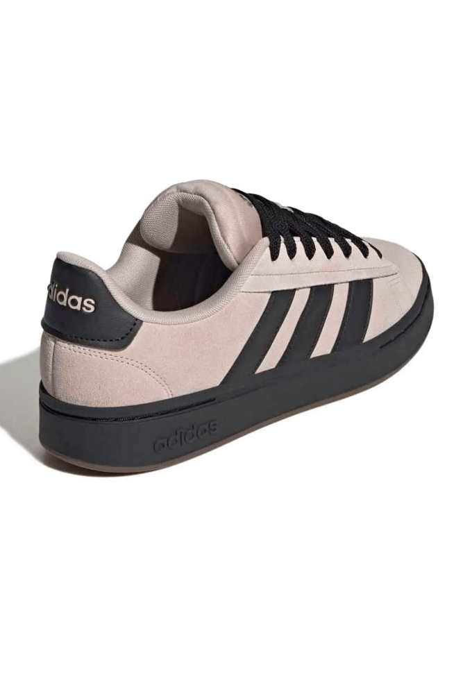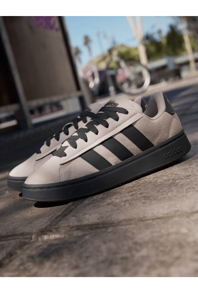 Para um visual casual urbano, combine o tênis adidas Grand Court Alpha com calça jeans ou chino, camiseta básica ou polo e jaqueta leve. Finalize com relógio esportivo e mochila minimalista, criando um look moderno, confortável e versátil para passeios, encontros com amigos ou compromissos informais.