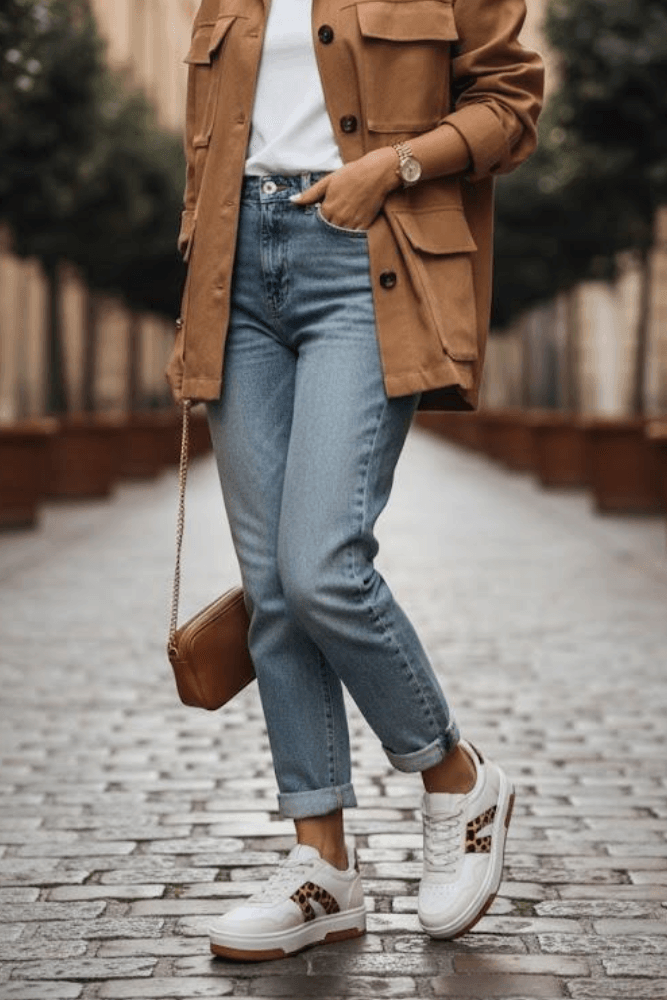 Para um passeio de domingo ou um café com as amigas, combine o Tênis Chá De Mel com uma calça jeans mom de cintura alta, camiseta branca oversized e uma jaqueta de couro ecológico preta. Finalize com acessórios dourados e uma bolsa tiracolo pequena. O detalhe animal print do tênis dá o toque fashion ao look casual.