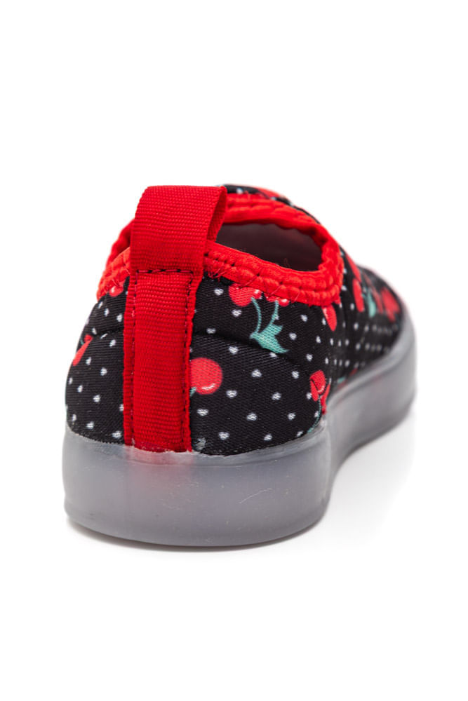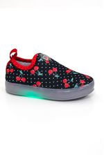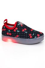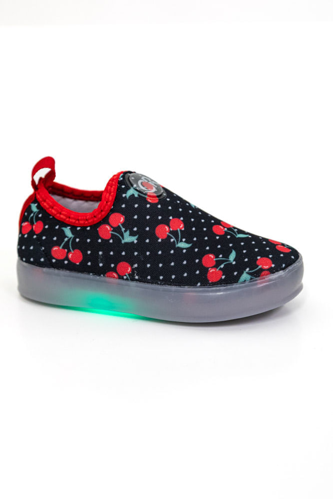 O Tênis Crik Casual Infantil Menina Slip On Luz Led Cr01/Cereja é perfeito para as meninas que amam estilo e conforto. Da categoria casual infantil, ele possui cabedal em tecido macio estampado com delicadas cerejas, garantindo um visual encantador. A sola em sintético transparente com luzes de LED que acendem ao caminhar proporciona um toque divertido e moderno. O bico é arredondado, sem fecho, com calce fácil estilo slip on. Internamente, conta com palmilha confortável, calcanheira acolchoada e acabamento macio que não machuca. Um benefício marcante é o conforto aliado à diversão das luzes, ideal para o dia a dia!