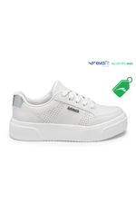 A sola caixa alta de EVAfit com 4 cm oferece excelente amortecimento e leveza, reduzindo o impacto ao caminhar e garantindo bem-estar ao longo do dia. O bico arredondado complementa o visual com um toque de delicadeza, enquanto o fecho por cadarços reguláveis permite um ajuste preciso e seguro, moldando-se perfeitamente ao formato do pé. Além disso, a palmilha em EVA impermeável contribui para um caminhar ainda mais macio e confortável.